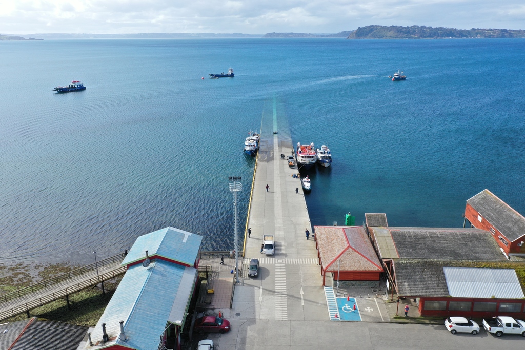 Muelle sobre pilotes hincados y anclados en roca, explanada, enrocado y arquitectura